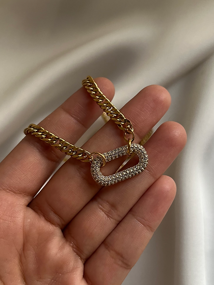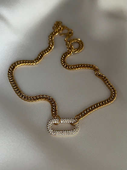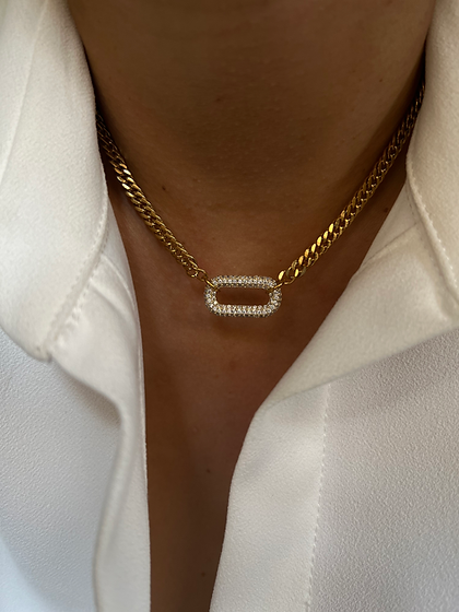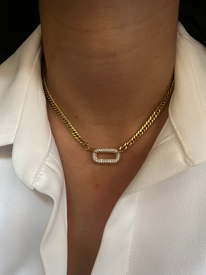 Cuban chain necklace with CZ stone embellished oval brass pendant.